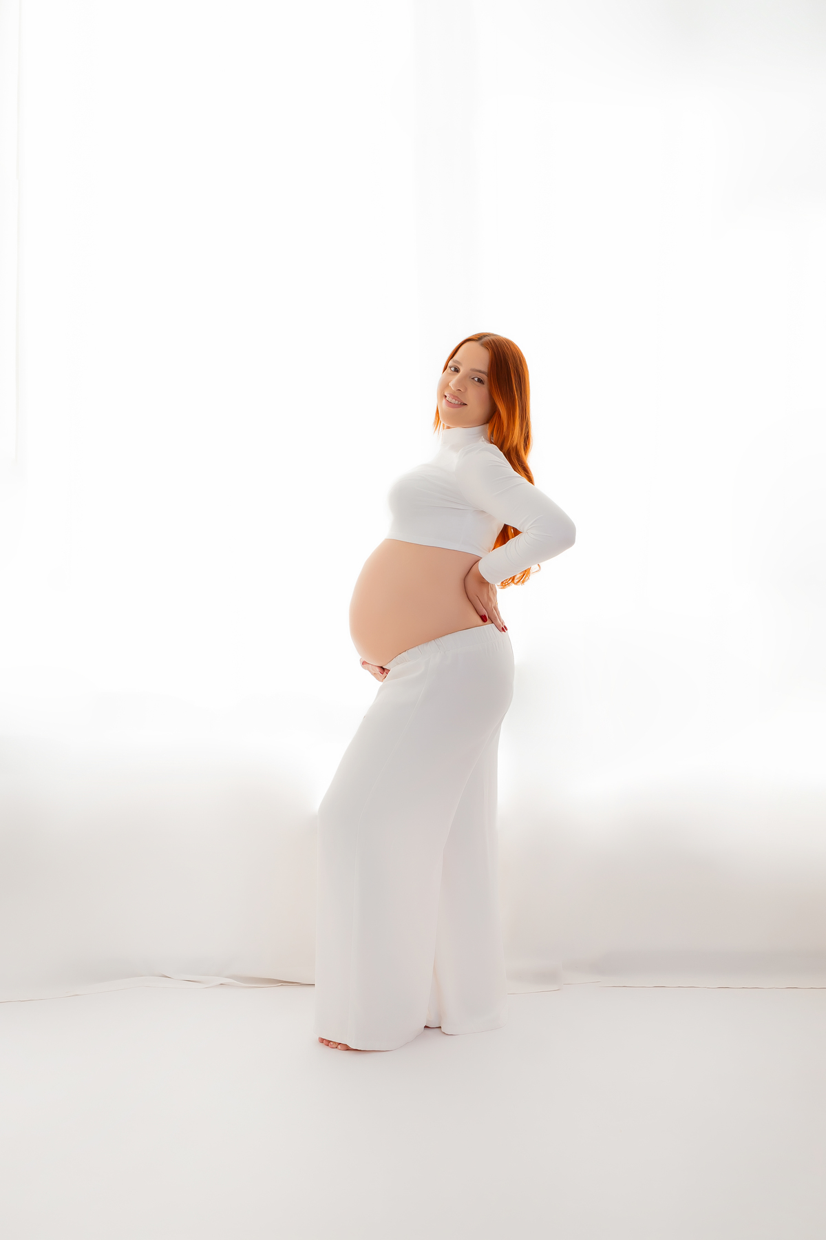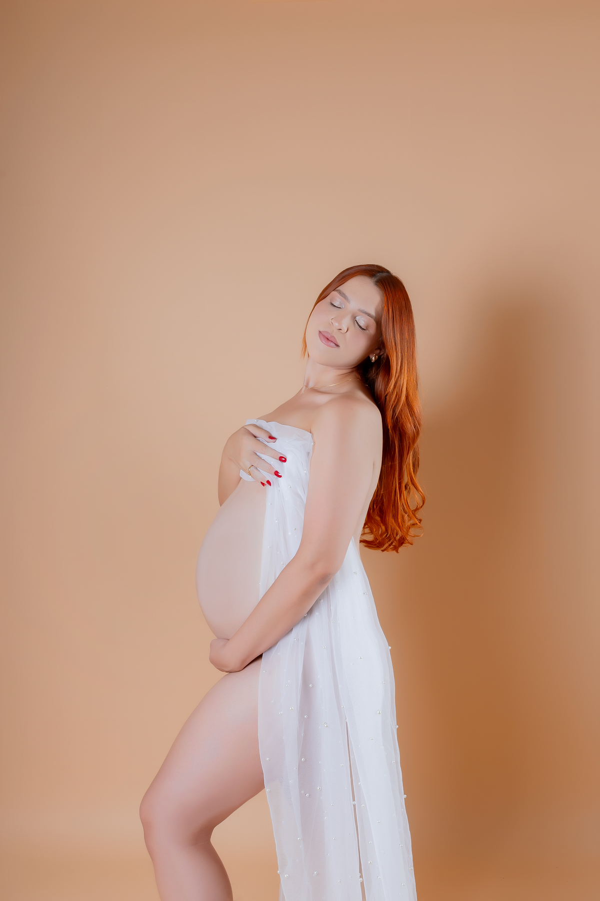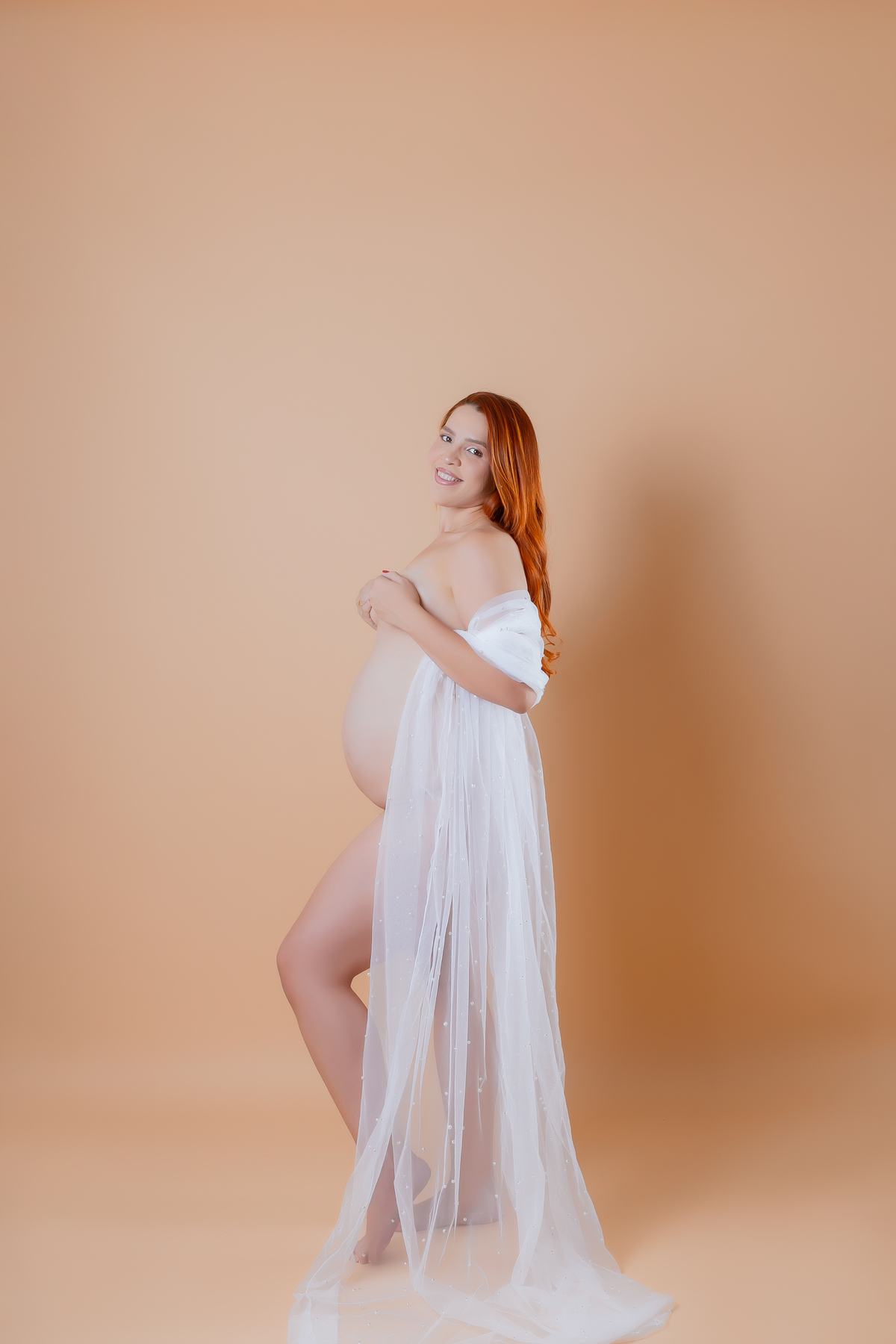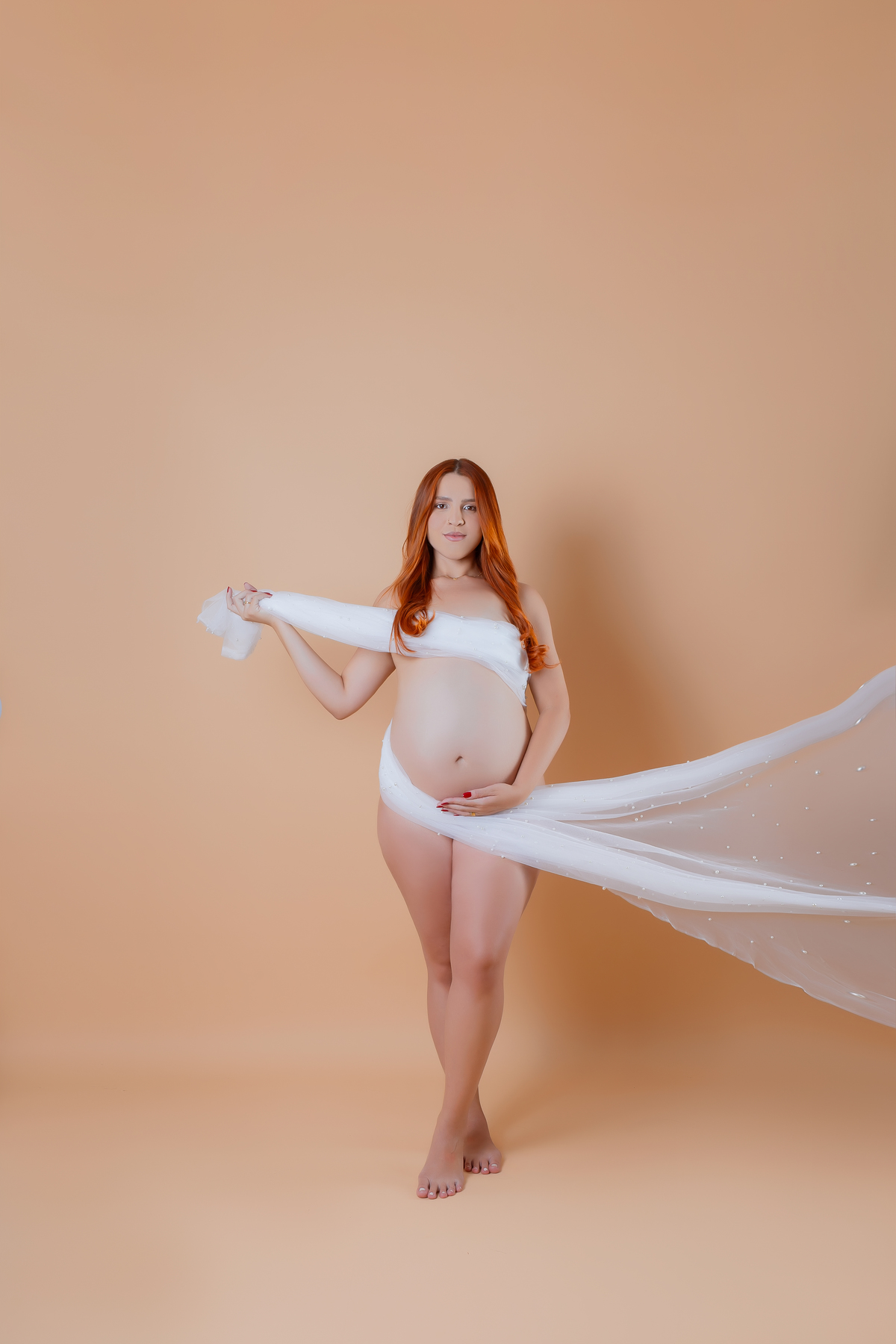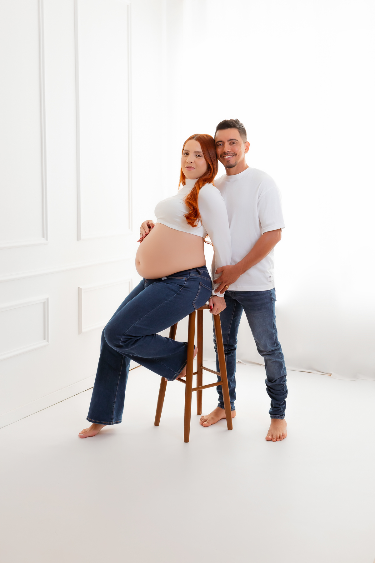 A luz é cuidadosamente trabalhada para manter uma estética natural, limpa e emocional, valorizando o essencial: a mulher, a gestação, o momento vivido.